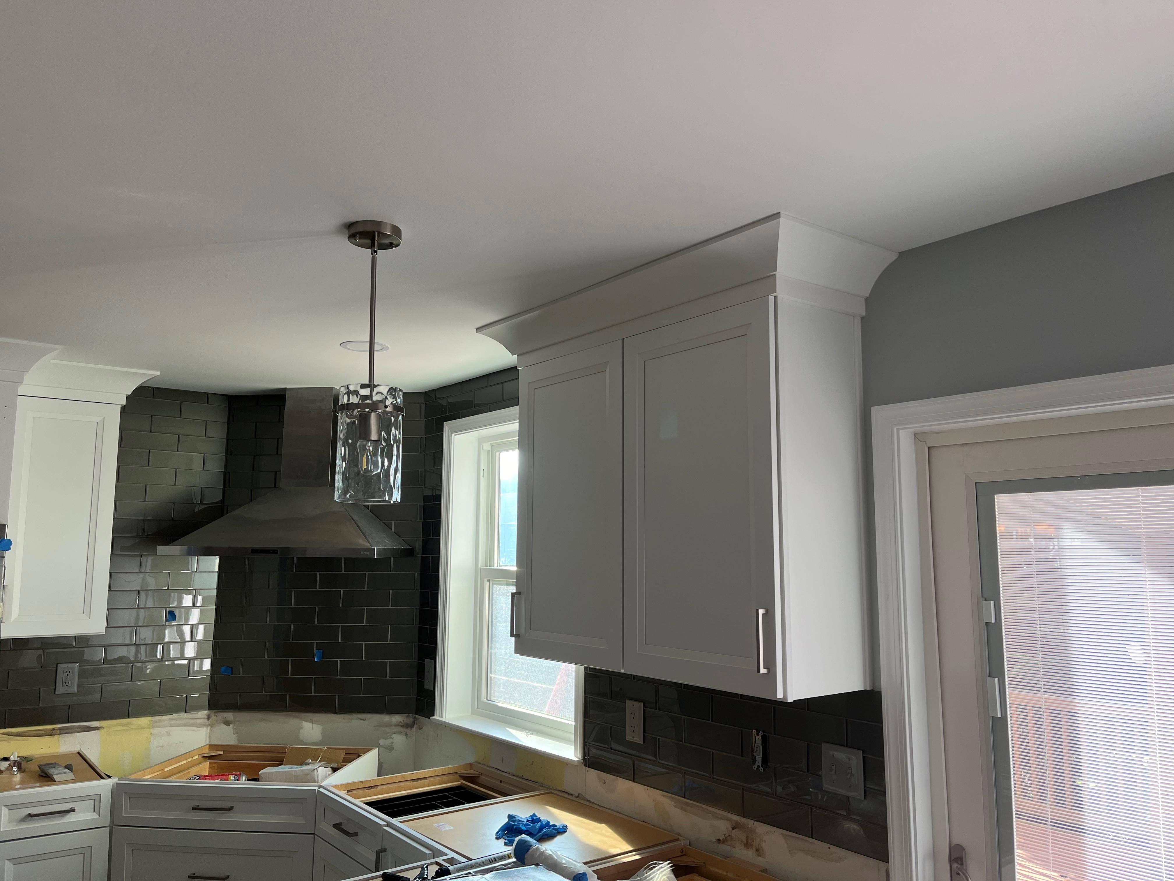 The ceiling in the kitchen was painted though there are stubborn spots to touch up. The basement door (in the kitchen) was painted along with the trim around the new window.