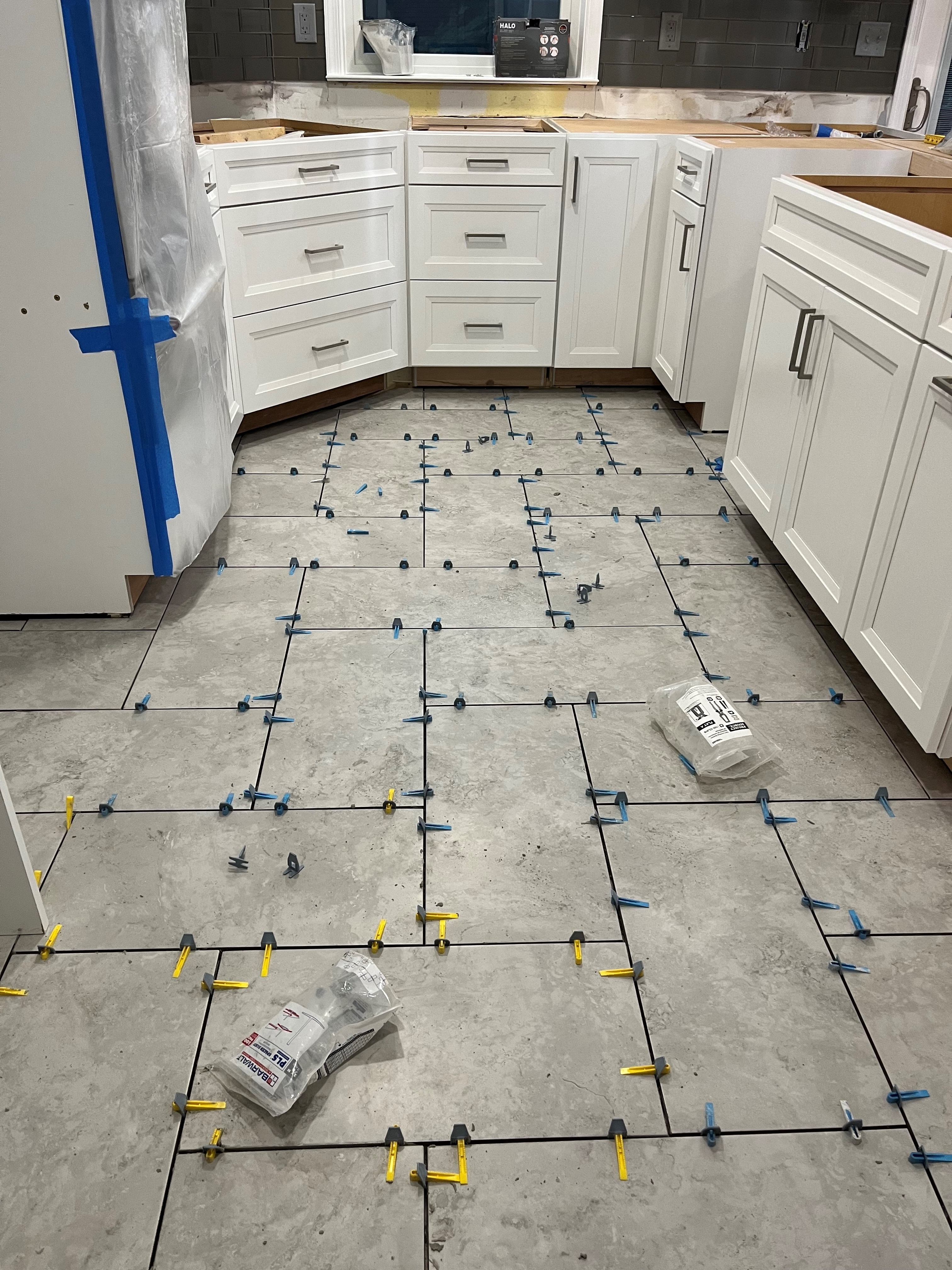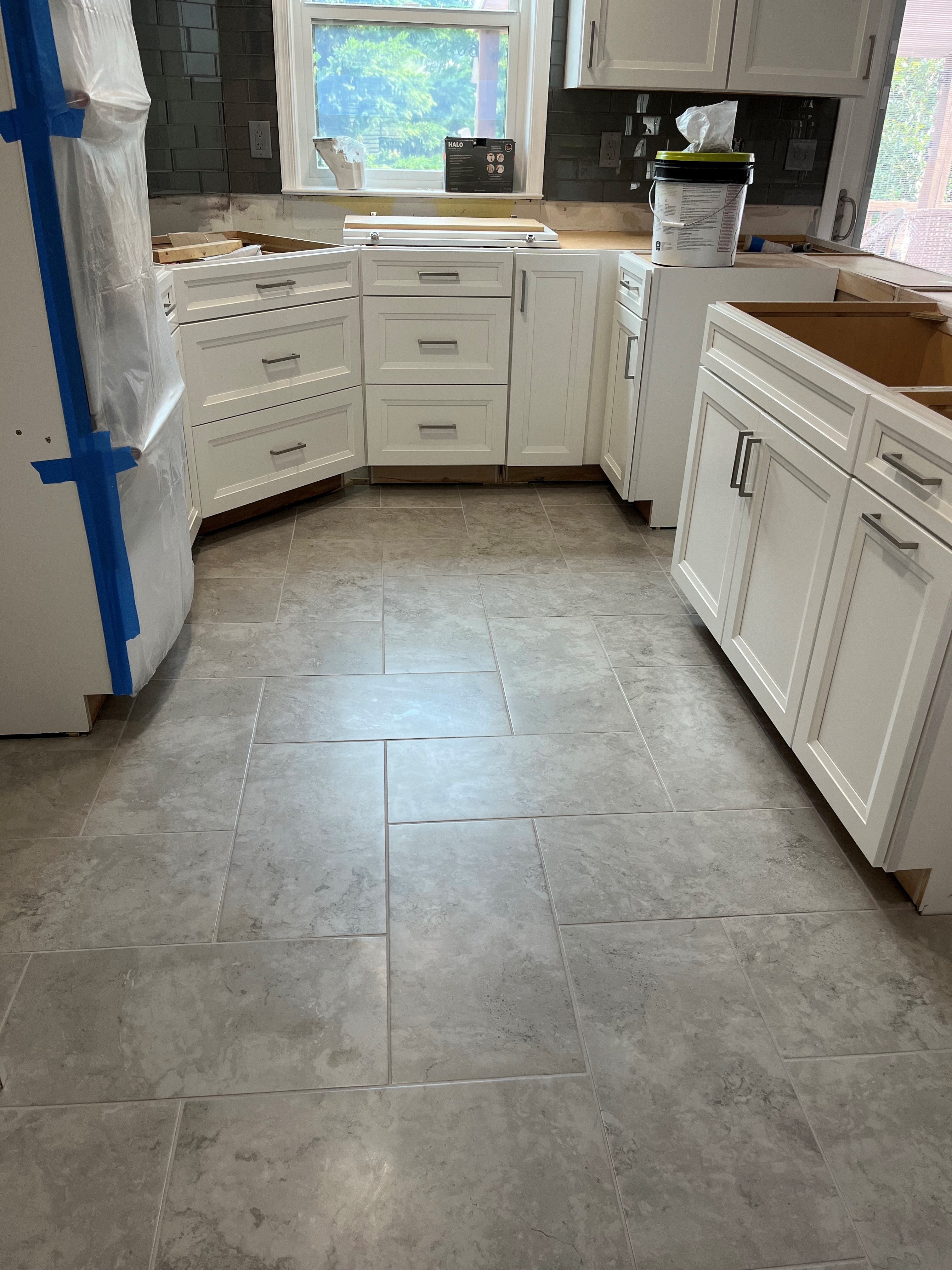 This was the week of the floors. All the tiling was done for both the kitchen and laundry room. The tiling continued from the family room that was done last year so now the flooring is the same throughout the three rooms.