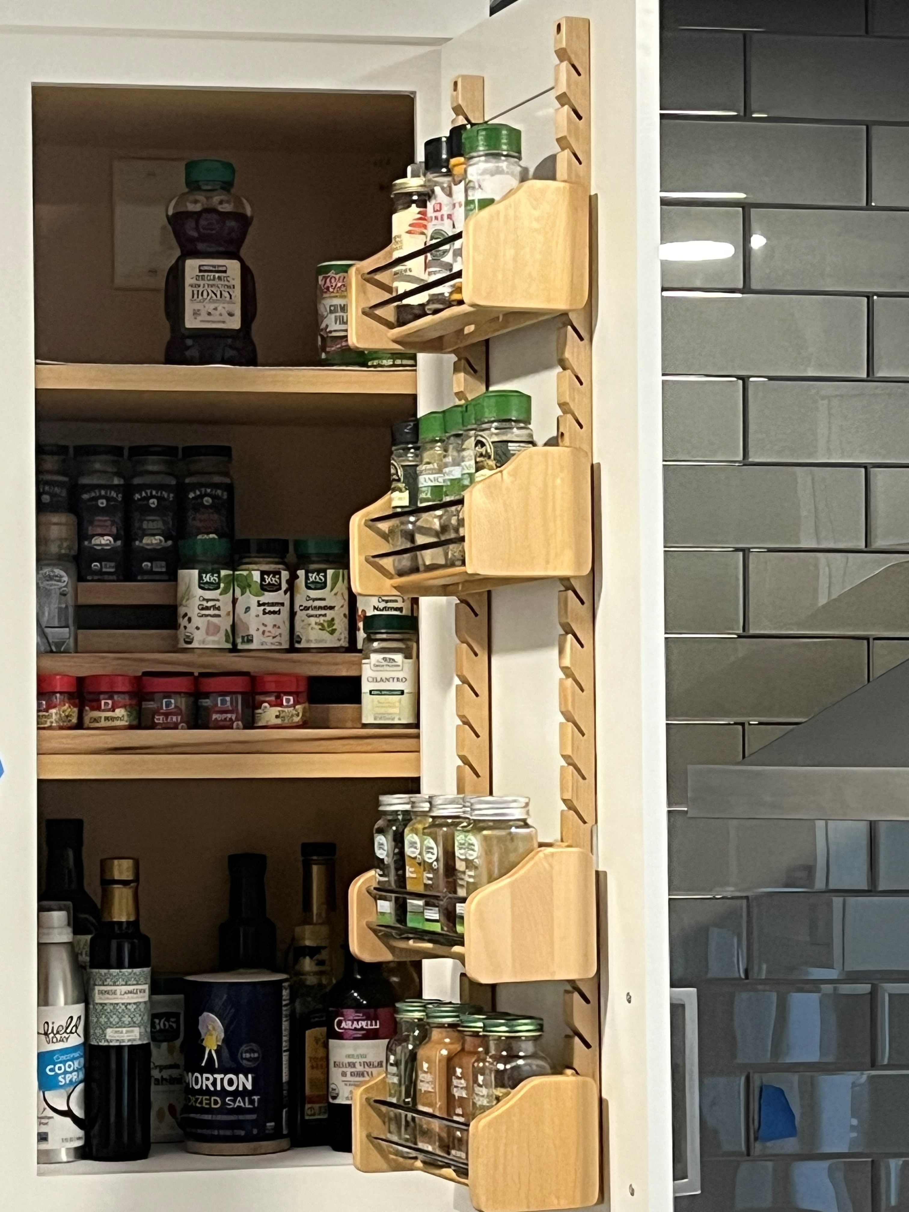 ++ The spice cabinet inserts and the pull-out shelf for a lower cabinet were installed. I am so thankful that the contractor offered to do this for me. The pull-out shelf instructions looked complicated and some of the spice shelves required cutting to fit. I’m proud of the spice cabinet – I wanted one set up so that I can see all the spices at once without rifling through layers of containers.
