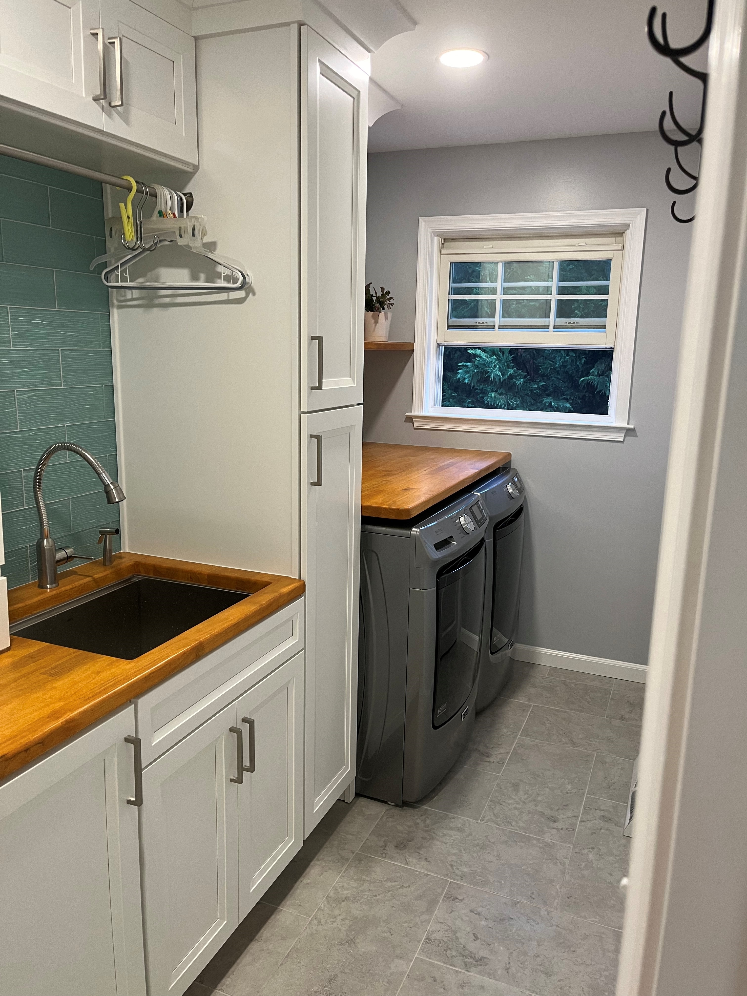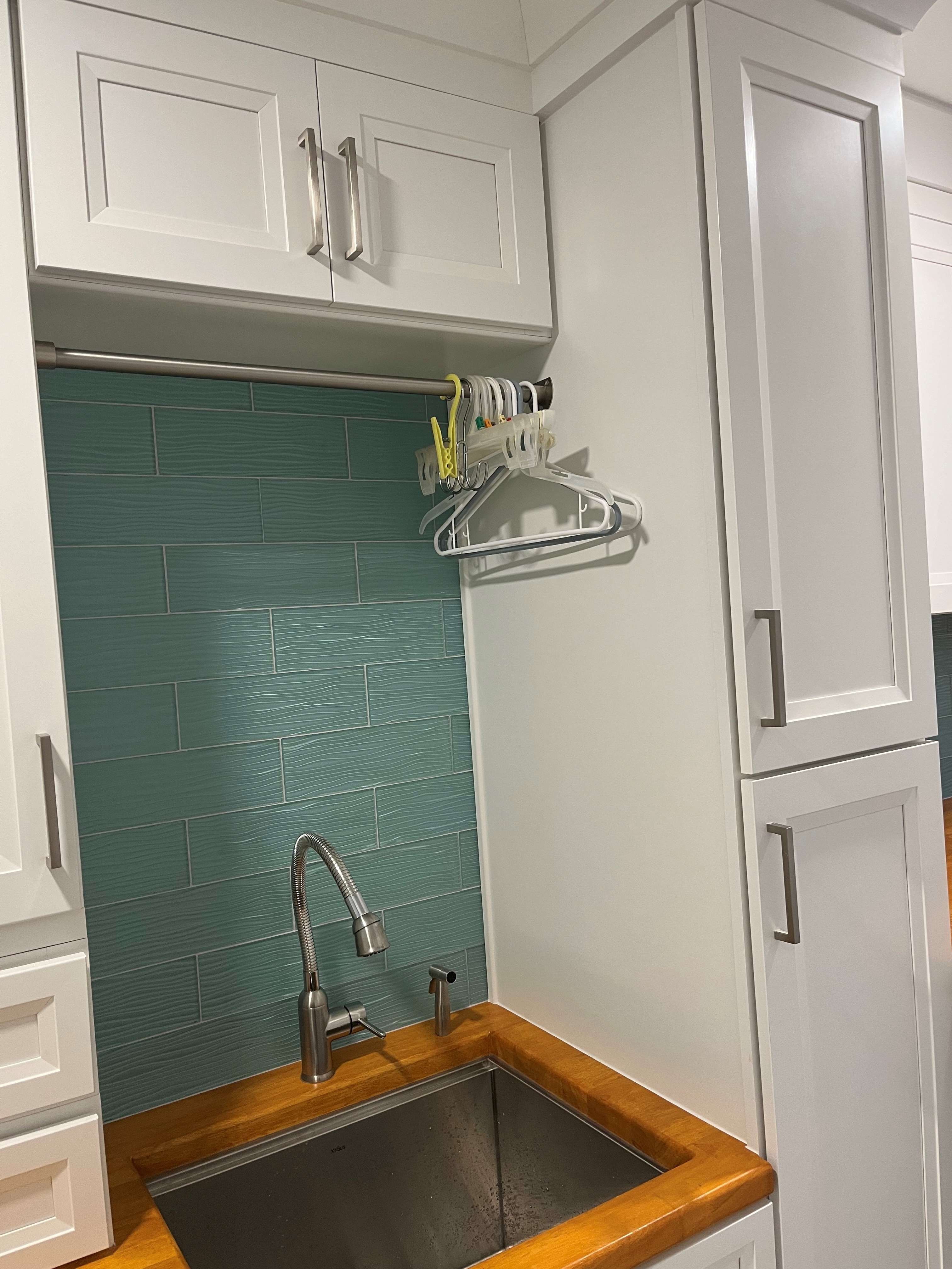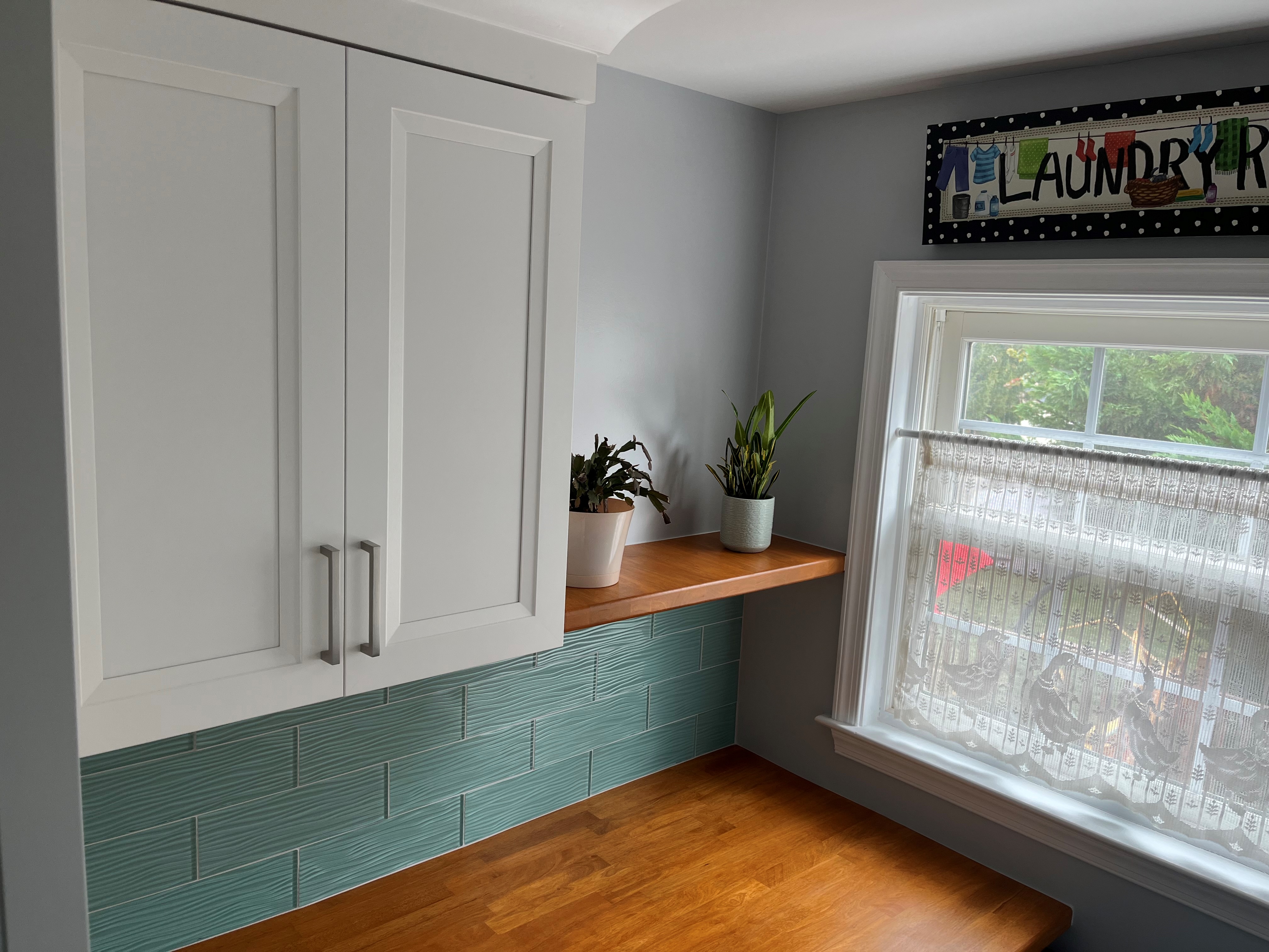 I made what think was the last design decision for me – the color for the laundry butcherblock counters. They will be stained. I chose a darker stain that I envisioned because it looked nice next to the light teal glass tile for the backsplash.