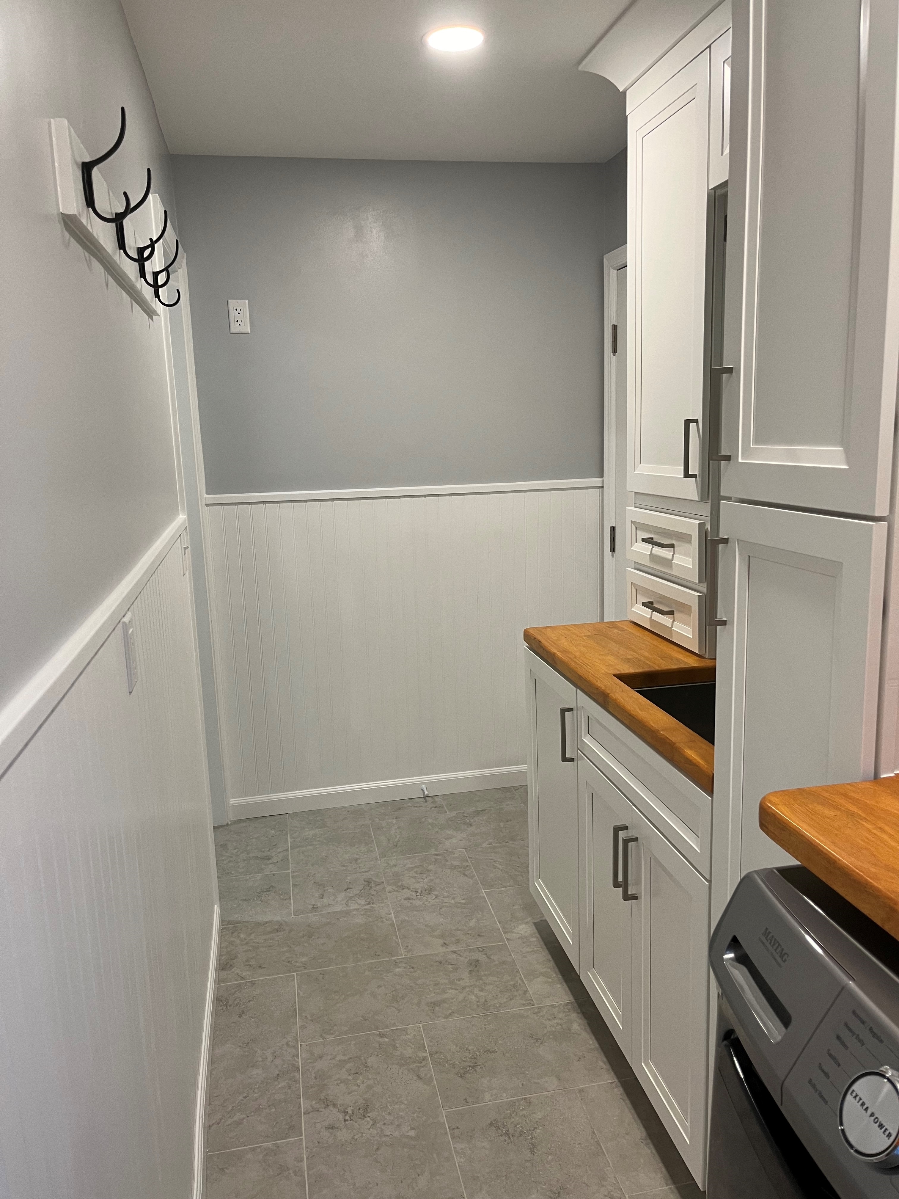 ++ Beadboard was installed on the two walls in the laundry room. I wish I’d had this when the boys were young – it’s so much easier to keep clean than sheetrock.